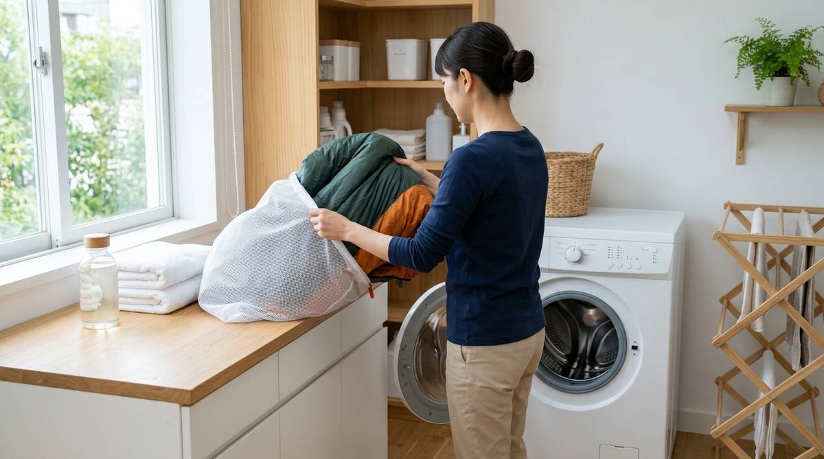 洗濯機のバランスが崩れないよう、寝袋をネットに入れて形を整え、遠心力を均等に分散させる工夫を凝らしましょう。