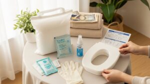 携帯用トイレ本体のほかに用意しておくと便利な品は絞りましょう。ウェットティッシュ、ビニール手袋、消臭スプレー、簡易ゴミ袋はあれば安心です。これらを小さなポーチにまとめておくと取り出しやすくなります。