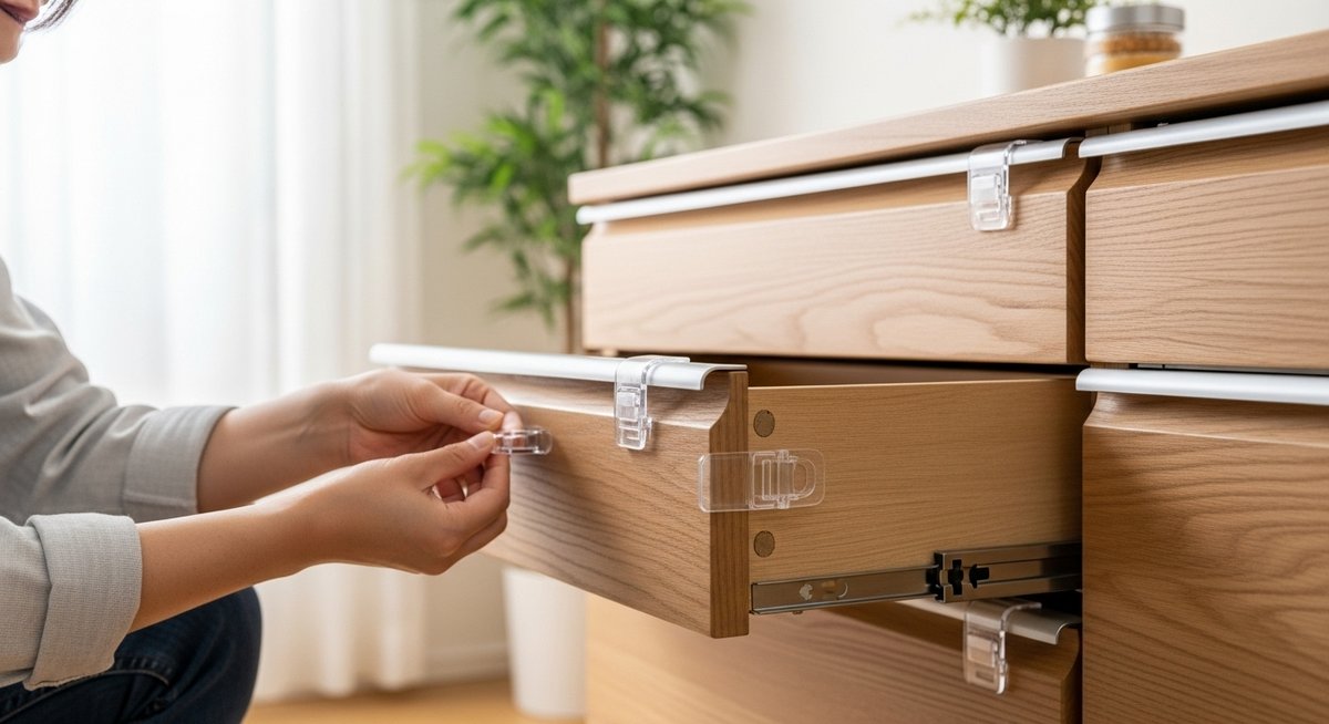 引き出しの前面と、家具の本体フレームを外部から直接つなぎ留める「ロック機構」は、最も強力な飛び出し防止策の一つです。これは「物理的な結合」を利用した仕組みで、ベルト式、ラッチ式、回転式など様々な形状が存在します。100均で「ベビーガード」や「多目的ロック」として販売されている商品の多くがこのカテゴリーに含まれます。この仕組みの最大の特徴は、引き出しを「閉じた状態」で完全に固定できるため、上下左右どの方向からの揺れに対しても高い耐性を誇る点です。