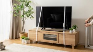 家具同士をベルトや結束バンドで連結すると、倒れる力を分散できます。例えばテレビ台と背後の本棚をつなぐ方法や、テレビ台と壁とを繋ぐストラップを利用する方法があります。連結部分は緩みやすいので定期的に点検してください。