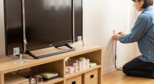子供やペットがいる場合は、テレビの前後左右に動きが伝わりやすいため、滑り止めだけでなく背面の抑えを必ず用意してください。低い位置で手が届くテレビは引っ張られるリスクが高いので、ワイヤーや粘着フックで後方固定を行います。